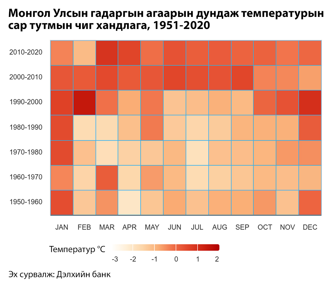 Түүнчлэн Азийн Хөгжлийн Банкны 2021 онд хийсэн судалгаанаас үзвэл Монгол Улсын агаарын хэмийн дулаарлын түвшин дэлхийн дунджаас хамаагүй илүү буюу энэ зууны эцэс гэхэд дундаж агаарын температур хамгийн ихдээ цельсийн 5.3 хэмээр дулаарах төлөвтэй аж. Харин 2050-аад оны үед ган, хуурайшилтаас шалтгаалсан малын хорогдол 50 орчим хувиар нэмэгдэх тооцоог НҮБ-ын Уур амьсгалын өөрчлөлтийн суурь конвенцын судалгаанд дурдсан байна.