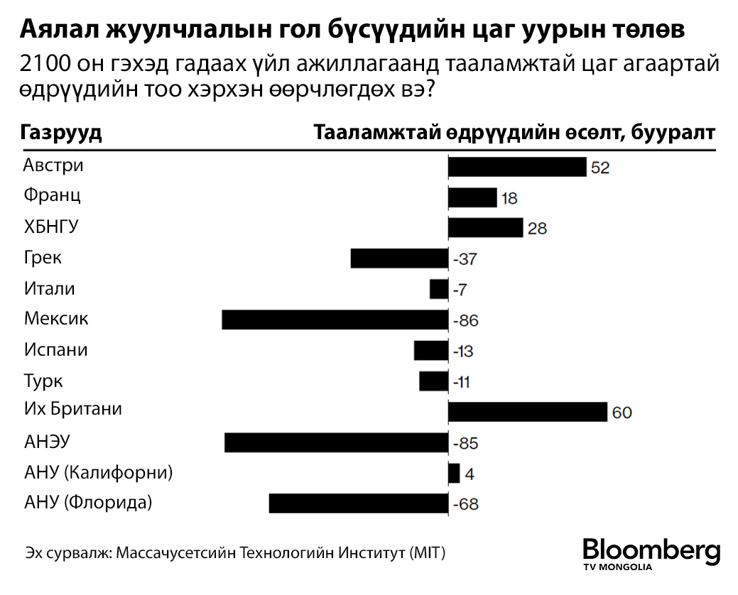 “ОХУ, Канад болон хойд хэсгийн бусад улсуудын хувьд ирээдүйд гадаа цаг өнгөөрөхөд тааламжтай өдрүүдийн тоо нэмэгдэнэ. Нөгөө талдаа Кот’д Ивуар зэрэг хөгжиж буй орнуудад ийм өдрийн тоо цөөрнө” хэмээн судалгааны багийн гишүүн, MIT-ийн судлаач Ёну Чой онцолж байна.
