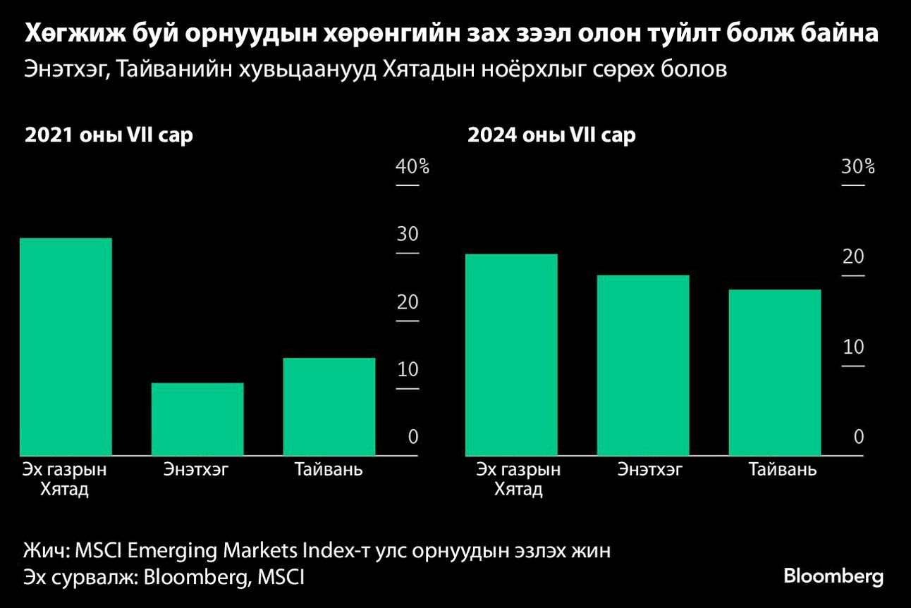 Хөгжиж буй орнуудын “MSCI Index” даваа гарагт 0.5 хувиар өслөө. Мөн “Taiwan Semiconductor Manufacturing”, “Tencent Holding” компанийн хувьцааны ханш огцом өссөн байна. Валютуудын хувьд холимог дүр зурагтай байгаа бөгөөд Мексикийн песо бусад Латин Америкийн орнуудын валютыг өсөлтөөрөө тэргүүллээ.