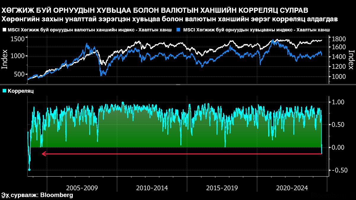 Хөрөнгийн захын өсөлт нь хөгжиж буй орнуудын үнэт цаас болон валютын жишиг индексүүдийн тренд ялгаатай байгааг харуулж байгаа юм. Өнгөрсөн пүрэв гарагт 2003 оноос хойш анх удаа сөрөг утга руу ороод байсан үнэт цаас болон валютын ханшийн 20 өдрийн корреляци, одоогийн байдлаар 0 рүү дөхөж ирээд байна.