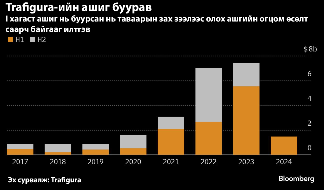 Түүхий эдийн арилжааны гол тоглогч болох “Trafigura Group” компанийн ашиг 73 хувиар буурсан байна. Ийнхүү тус компанийн оны эхний хагас жилийн цэвэр ашиг 2020 оноос хойших хамгийн доод түвшинд хүрлээ. Энэ нь таваарын арилжааны бизнесээс олох ашгийн огцом өсөлтийн цикл дуусаж буйг илтгэж байна.