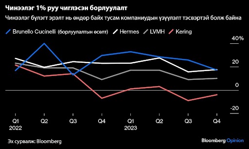 Харин “Gucci” одоо бусад брэндийн адил чинээлэг худалдан авагчдыг татахыг эрмэлзэж байна. Ингэх нь ч аргагүй юм. Тансаг зэрэглэлийн бүтээгдэхүүн авах сонирхолтой АНУ-ын худалдан авагчдад инфляц, бодлогын хүүгийн өсөлт санхүүгийн дарамт учруулах нь багасаж байна. Харин хятад худалдан авагчид болгоомжилсон хэвээр. Энэ хооронд “Hermes”, “Brunello Cucinelli” компаниуд борлуулалтын өсөлтөөрөө өрсөлдөгчдөө давсан байна. Эдгээр компани “1 хувь” гэгдэх чинээлэг худалдан авагчдыг зорилтот зах зээлээ болгодог юм. Харин дундаж давхарга руу илүүтэй чиглэдэг “Kering”, Английн “Burberry” компаниудад хүндрэлтэй нөхцөл байдал үүсээд байгаа ажээ.