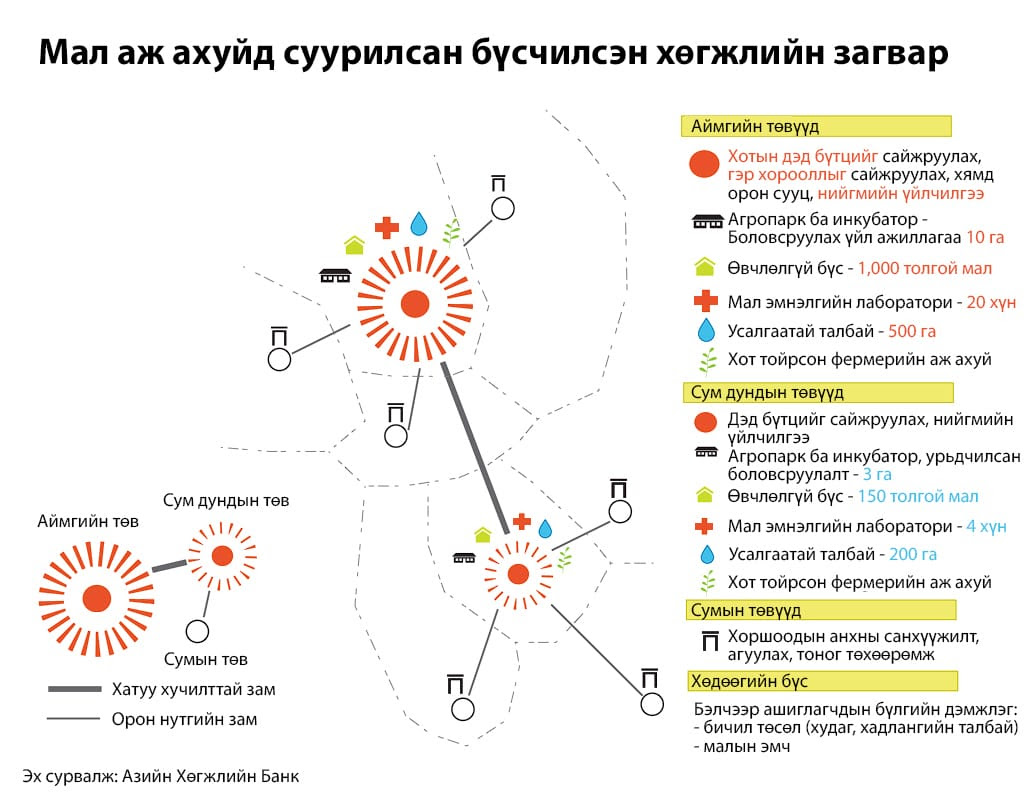Азийн Хөгжлийн банкны судалгаанд орон нутаг дахь хүн амын төвлөрөл нь голчлон мал аж ахуйгаас шалтгаалсан хэвээр байна. Иймд мал аж ахуйн салбарын үр дүнтэй ажиллагааг хангаж, үнэ цэний сүлжээ бий болгох тодорхой үүрэг бүхий төвүүдээс бүрдсэн суурин газрын шаталсан тогтолцоог үүсгэх нь чухал гэсэн гол санааг дэвшүүлжээ. Тухайлбал: ноолуурыг ангилахаас эхлээд нэхэх, сүлжих шат дамжлагууд дийлэнхдээ Улаанбаатарт хийгдэж байна. Тиймээс ноолуур боловсруулах шат дамжлагыг зарим сум, аймгийн төвүүдэд хийх шаардлагатай гэж үзжээ.