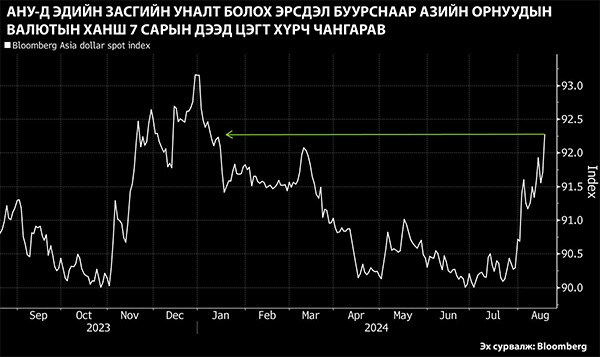 АНУ-ын эдийн засаг уналтад орно гэсэн болгоомжлол буурч, Холбооны Нөөцийн банк ирэх сард бодлогын хүүгээ бууруулна гэсэн хүлээлт нэмэгдээд байна. Энэ нь Ази, Номхон далайн бүс нутагт нөхцөл байдал сайжирна гэсэн өөдрөг хүлээлт үүсгэснээр Азийн улсуудын валютын ханш сүүлийн долоон сарын дээд түвшинд хүрч чангарлаа. Тодруулбал: “Bloomberg Asia Dollar Index” даваа гарагт 0.6 хувиар өсөж, нэгдүгээр сараас хойших дээд цэгтээ хүрээд байна. Малайзын рингит болон БНСУ-ын вон өсөлтөөрөө тэргүүлсэн бол улс төрийн хурцадмал байдал саарснаар тайланд батын ханш чангарчээ.