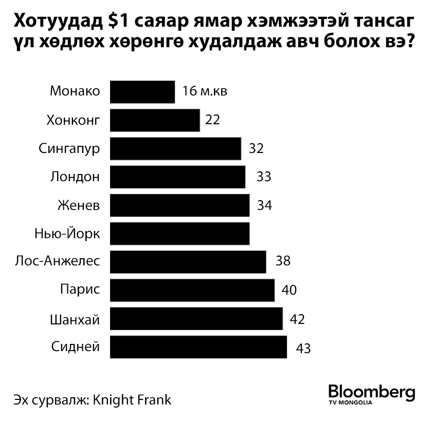 Дүгнэлт: Зах зээлийн Топ-5 хувь хэмээгддэг тансаг зэрэглэлийн үл хөдлөх хөрөнгийн зах зээл дээр нэг сая ам.доллароор хүссэн орон сууцаа авч чадахгүй нь. Нью-Йоркт бол ийм үнээр 34 м.кв талбайтай тансаг орон сууц авна. Харин Францын нийслэл Парис хотод 40 м.кв, БНХАУ-ын Шанхайд 42 м.кв орон сууц авах аж.