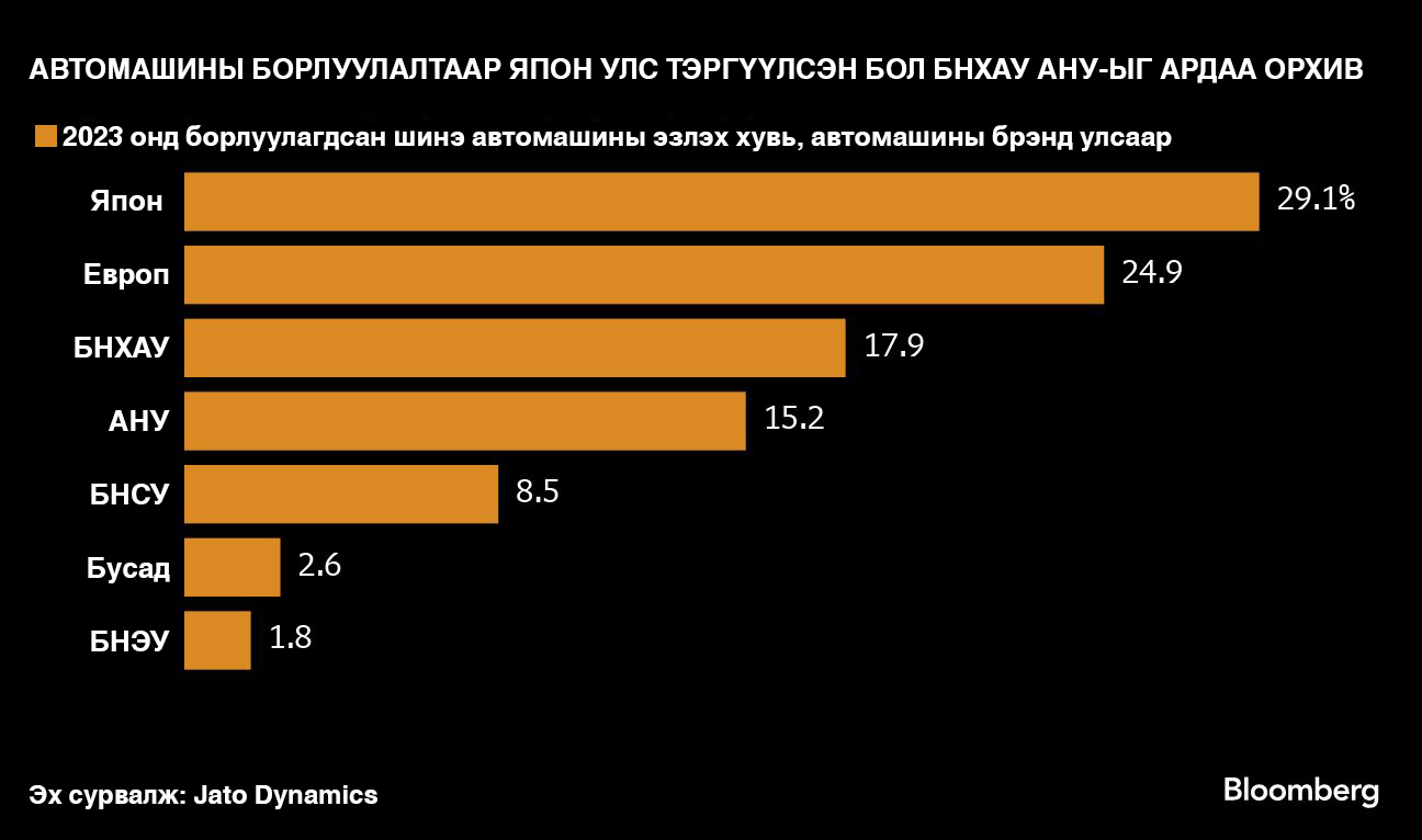 “BYD” зэрэг компани өнгөрсөн онд 13.4 сая тээврийн хэрэгсэл борлуулсан бол “Ford Motor” болон “Chevrolet” зэрэг АНУ-ын брэнд 11.9 сая автомашин борлуулсныг “Jato Dynamics”-ийн судалгаа харууллаа. Харин Японы автомашин үйлдвэрлэгчид хамгийн сайн үзүүлэлттэй буюу тайлант хугацаанд 23.6 сая орчим автомашин зах зээлд нийлүүлсэн байна.